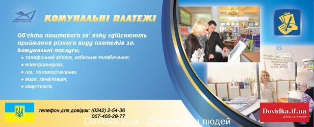 Івано-Франківська дирекція УДППЗ «Укрпошта» є - філіалом Українського державного підприємства поштового зв’язку «Укрпошти» національного оператора поштового зв’язку України. Підприємство відіграє важливу роль у сфері соціального захисту населення: забезпечує надання послуг поштового зв’язку  на всій території України за доступними тарифами. Завдяки підтримці розгалуженої мережі об’єктів поштового зв’язку Укрпошта має можливість надавати послуги у найвіддаленіших населених пунктах України, чого не робить жоден приватний оператор на ринку поштових послуг. Отож громадяни, які проживають навіть у віддалених місцевостях, не втрачають контакт із зовнішнім світом. До складу   Івано-Франківської дирекції входить 467 відділень поштового зв’язку, в тому числі   403 сільських, 64 міських які обслуговують  населення області.     Івано-Франківська дирекція УДППЗ «Укрпошта» повідомляє про те, що на даний час  пропонує  більше 50 видів поштових послуг, у тому числі прості та   рекомендовані листи, бандеролі з оголошеною цінністю, дрібні пакети, обробка та вручення посилок, приймання та обробка міжнародних посилок, приймання та виплата переказів, здійснення передплати та доставки періодичних друкованих видань, сервіс «Кур’єрська доставка» та інше, за прийнятними цінами, суттєво нижчими за ціни комерційних структур. 1. Сервіс “Кур’єрська доставка” 2. «Є доставка!» 3Послуга з доставки та розміщення рекламної інформаційної продукції 4.  Приймання платежів об’єктами поштового зв’язку 5Послуга «Власна марка» 6. Послуга «Електронний квиток» 7. Оренда скриньки 8. Cтрахування компаніями 9. Проект «Адміністартивні послуги: спрощений доступ через пошту” 10. Інші послуги 1. Сервіс “Кур’єрська доставка” – це надійний спосіб доставки Вашого відправлення по всій Україні. Лише ми доставляємо поштові відправлення навіть у найвіддаленіші куточки України швидко та вчасно. До Ваших послуг розрахунок вартості кур’єрської доставки перед замовленням, вибір упакування, виклик кур’єра онлайн. Спробуйте зараз! Кур’єрська служба здійснює доставку відправлень за технологією: Сервіс “Кур’єрська доставка” dovidka.if.ua УКРАЇНСЬКЕ ДЕРЖАВНЕ ПІДПРИЄМСТВО ПОШТОВОГО ЗВ`ЯЗКУ «УКРПОШТА»   ІВАНО-ФРАНКІВСЬКА ДИРЕКЦІЯ Ивано-Франковская дирекция УКРАИНСКОЕ ГОСУДАРСТВЕННОЕ ПРЕДПРИЯТИЕ ПОЧТОВОЙ СВЯЗИ «УКРПОЧТА»- «Двері – Двері» - кур’єр здійснює забір відправлень з дому/офісу та доставку відправлення додому/та або в офіс; - “Двері – Склад” - кур’єр забирає відправлення з дому/офісу, проте видача відбувається в Дільниці кур’єрської доставки та/або об’єкті поштового зв’язку; - “Склад – Двері” – приймання відправлень в Дільниці кур’єрської доставки та/або в об’єкті поштового зв’язку, а  доставка  -  кур’єром додому та/або в офіс. Терміни пересилання відправлень«Кур’єрська доставка» між обласними центрами України становить від 2 до 4 днів. В межах області наступного дня, в межах міста на протязі дня. Замовити послугу «Кур’єрська доставка»  можливо: 1) в дільниці кур’єрської доставки та виділеннях  поштового зв'язку; 2) за телефоном; (0342) 55-25-93; 067 400 29 64; 3) оформивши он-лайн замовлення; З іншими умовами замовлення, проектом договору, тарифами сервісу «Кур’єрська доставка» наші фахівці з готовністю ознайомлять відповідальних осіб установ та організа